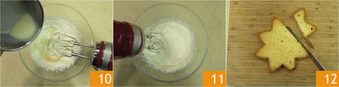Gießen Sie die Sahne-Gelatine-Mischung über die Joghurtcreme 10 und bearbeiten Sie sie noch 2 Minuten mit dem elektrischen Handmixer 11. Halten Sie die Creme bereit. Schneiden Sie 1 cm dicke Scheiben Pandoro, entfernen Sie den Rand 12