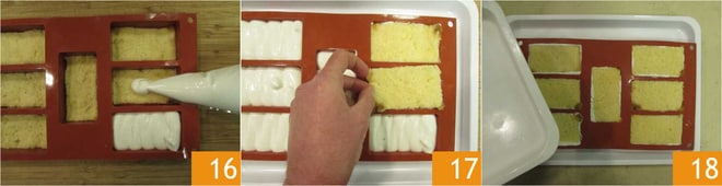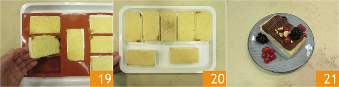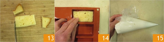 und schneiden Sie 14 Rechtecke von 5x9 cm aus 13. Legen Sie 7 Pandoro-Rechtecke in eine Silikonform mit 7 Portionen 14 und drücken Sie sie leicht mit den Fingern an. Geben Sie die Joghurtcreme in einen Spritzbeutel ohne Tülle 15.