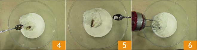 den Vanilleextrakt 4 und das Salz 5. Mit einem elektrischen Handmixer die Zutaten etwa 2 Minuten lang verrühren 6.