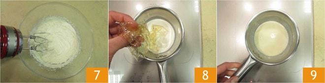 Stellen Sie die aufgeschlagene Mischung beiseite 7. In einen kleinen Topf geben Sie die anderen 20 g frische Sahne und fügen die zuvor eingeweichte Gelatine mit einem Teil des Einweichwassers hinzu 8 für ein Gesamtgewicht von 25 g. Erhitzen Sie die Zutaten, bis die Gelatine vollständig aufgelöst ist 9.