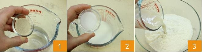 Um das Weihnachtsmann-Brot zuzubereiten, beginnen Sie damit, die Hefe zusammen mit dem lauwarmen Wasser aufzulösen 1, während Sie in die lauwarme Milch den Zucker 2 und das Salz geben und umrühren, um die Zutaten zu vermischen. Nehmen Sie eine große Schüssel und geben Sie das gesiebte Mehl hinein, dann fügen Sie zuerst das Wasser hinzu, in dem Sie die Hefe aufgelöst haben 3,