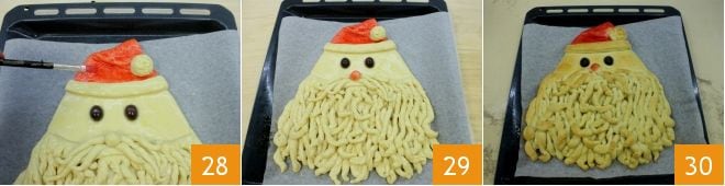 Mit einem Pinsel färben Sie die Mütze 28 und die Nase 29 rot und backen Sie dann das Weihnachtsmann-Brot im vorgeheizten statischen Ofen bei 180° für 35 Minuten (wenn Umluft bei 160° für etwa 25-30 Minuten). Wenn es fertig ist, nehmen Sie es aus dem Ofen 30, lassen Sie es abkühlen und genießen Sie es, um Weihnachten zu feiern!