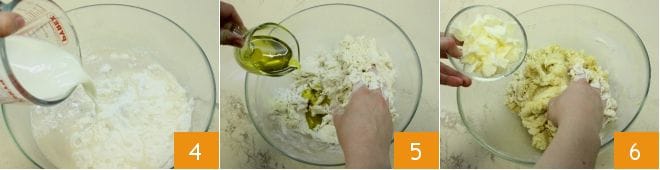 dann fügen Sie auch die Milch mit Zucker und Salz hinzu 4. Beginnen Sie zu kneten und geben Sie nach und nach das Olivenöl 5 in einem dünnen Strahl dazu. Wenn das Öl eingearbeitet ist, geben Sie auch die weiche Butter in kleinen Stücken 6 nach und nach dazu, wobei Sie mehr hinzufügen, wenn das vorherige eingearbeitet ist.