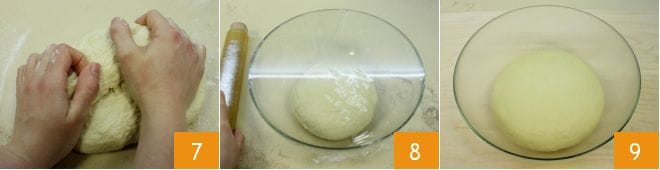 Kneten Sie alles in der Schüssel, dann übertragen Sie den Teig auf eine leicht bemehlte Arbeitsfläche. Bearbeiten Sie ihn kräftig 7, bis Sie einen weichen, homogenen und glatten Teig erhalten. Formen Sie eine Kugel, legen Sie sie in eine Schüssel, decken Sie sie mit Folie ab 8 und lassen Sie sie bei Zimmertemperatur für ein paar Stunden gehen (oder bis sich ihr Volumen verdoppelt hat) 9.