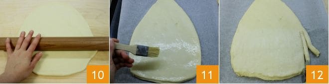Nach der erforderlichen Zeit nehmen Sie den Teig wieder auf, teilen Sie ihn in zwei Teile, einen von etwa 900 g und den anderen von 450 g. Rollen Sie den größeren aus 10 und formen Sie ein Dreieck mit einer Höhe von 36 cm, einer Spitze von etwa 6 cm und einer Basis von 23 cm mit abgerundeten Ecken, die den Kopf und die Mütze des Weihnachtsmanns darstellen. Legen Sie das Teigdreieck auf ein mit Backpapier ausgelegtes Blech und bestreichen Sie es mit Wasser 11. Dann schneiden Sie mit einem Teigschneider Streifen von etwa 1 cm Dicke über die gesamte Basis des Dreiecks 12.