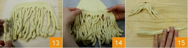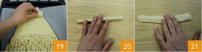 Vom restlichen Teig entfernen Sie ein Viertel, das zur Dekoration benötigt wird, während Sie den Rest leicht ausrollen und mit dem Teigschneider Streifen von 1 cm Dicke herstellen, die nicht vollständig durchgeschnitten werden 13. Drehen Sie die Streifen um sich selbst, um der Bart Bewegung zu verleihen, und legen Sie ihn etwa in der Mitte des Dreiecks ab, wobei Sie Platz für die Basis der Mütze und die Augen lassen 14. Mit einem Teil des übrig gebliebenen Teigs formen Sie Stangen unterschiedlicher Länge, die Sie zusammenfügen können, um die Schnurrbärte zu formen 15.