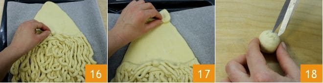 Machen Sie auch die Nase mit einem kleinen Teigball und legen Sie Nase und Schnurrbart in die Mitte des Barts 16. Dann falten Sie die Spitze leicht, um die Weihnachtsmütze zu simulieren 17, dann machen Sie einen Pompon und stechen Sie ihn mit der Schere an 18.
