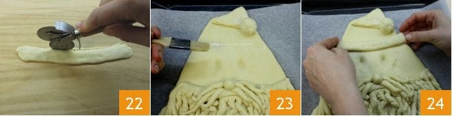 Verfeinern Sie den Rand mit einem gezahnten Teigschneider 22, bestreichen Sie die Stirn des Weihnachtsmanns mit Wasser 23 und legen Sie die Basis der Mütze darauf 24.
