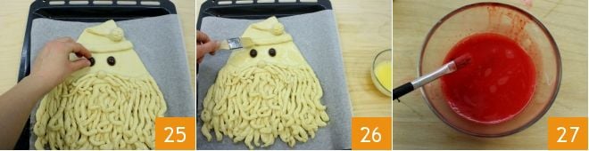 Erstellen Sie die Augen mit zwei schwarzen Oliven 25 und bestreichen Sie das gesamte Weihnachtsmann-Brot mit einem verquirlten Ei 26. In das übrig gebliebene verquirlte Ei geben Sie einige Tropfen rote Lebensmittelfarbe, bis Sie die gewünschte Färbung erhalten 27.