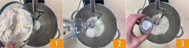 Um das Pfannenbrot vorzubereiten, geben Sie das Mehl in die Schüssel der Küchenmaschine 1, fügen dann das Wasser auf einmal hinzu 2 und das Salz 3.