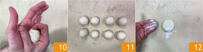 Drücken Sie das erste Teigstück leicht flach, falten Sie dann die Ränder zur Mitte und formen Sie es mit der Handfläche zu einer Kugel 10. Fahren Sie so auch mit den anderen Stücken fort, lassen Sie die Kugeln dann für 5 Minuten bei Raumtemperatur ruhen, bedeckt mit einem Tuch 11. An diesem Punkt mehlen Sie die Arbeitsfläche leicht und drücken die Kugeln leicht mit den Händen flach 12.