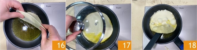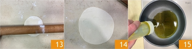 Rollen Sie sie mit einem Nudelholz aus 13, bis Sie einen Durchmesser von etwa 20 Zentimetern und eine Dicke von einem halben cm erreichen 14. Sollte sich der Teig zurückziehen, lassen Sie ihn noch ein paar Minuten ruhen und fahren Sie dann erneut fort. Sie sind bereit für das Kochen: Geben Sie das Öl in eine Antihaftpfanne 15 und erhitzen es.