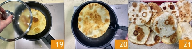 Braten Sie es weitere 3 Minuten, immer mit halb geschlossenem Deckel 19. Wenn es auf beiden Seiten schön goldbraun ist, nehmen Sie das Brot aus der Pfanne 20 und verfahren Sie auf diese Weise, um auch alle anderen zu backen. Ihr Pfannenbrot ist fertig, genießen Sie es noch heiß 21!