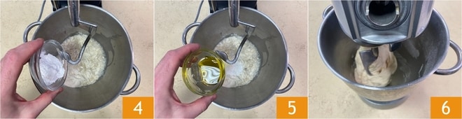 Geben Sie auch die Instanthefe für herzhafte Zubereitungen hinzu 4 und das Öl 5. Schalten Sie die Küchenmaschine auf mittlerer Geschwindigkeit ein 6.
