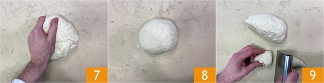 Nach etwa 5 Minuten erhalten Sie einen groben Teig, den Sie dann auf die Arbeitsfläche geben und kurz bearbeiten 7, bis Sie eine glatte und nicht klebrige Kugel formen 8. Teilen Sie den Teig mit einem Schaber in 8 Stücke 9.