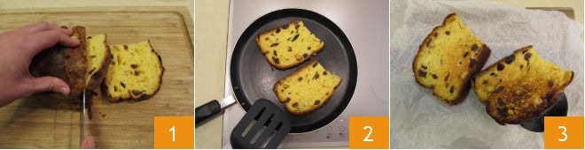 Um die Panettone-Bruschetta mit Gorgonzola zuzubereiten, schneiden Sie zuerst den übrig gebliebenen Panettone in dicke Scheiben 1. Erhitzen Sie eine Grillplatte und rösten Sie die Panettone-Scheiben für einige Augenblicke 2, gerade so lange, bis sie goldbraun sind 3.