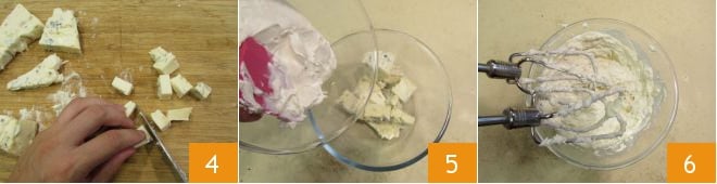 Entfernen Sie die Rinde vom Gorgonzola, würfeln Sie den Gorgonzola und geben Sie ihn in eine Schüssel, fügen Sie auch den Mascarpone hinzu 4 und bearbeiten Sie die Käse mit einem elektrischen Mixer auf niedriger Geschwindigkeit, bis Sie eine dichte Creme erhalten 5. Streichen Sie die Creme mit einem Spatel auf die gerösteten Panettone-Scheiben 6.