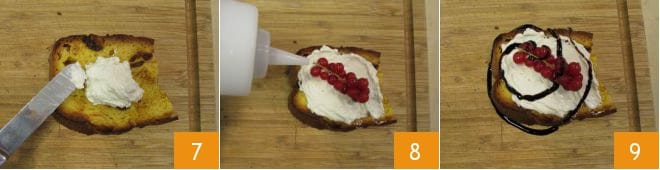 Garnieren Sie mit Johannisbeeren und Balsamico-Glasur 78. Die Panettone-Bruschetta mit Gorgonzola und Johannisbeeren sind bereit zum Genießen 9.