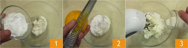 Um den Panettone gefüllt mit Sahne und Mascarpone zuzubereiten, bereiten Sie zuerst die Creme vor: Geben Sie den Mascarpone und den Puderzucker in eine Schüssel 1, fügen Sie die abgeriebene Orangenschale hinzu 2 und beginnen Sie mit dem Rührgerät zu arbeiten. Fügen Sie die Sahne hinzu, während Sie das Rührgerät laufen lassen 3.