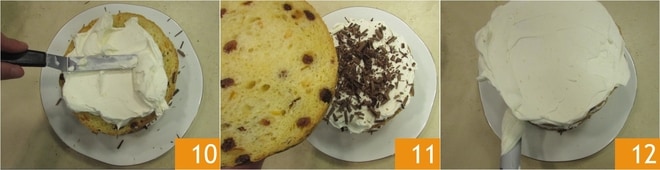 Streichen Sie eine weitere Schicht Creme 10 und fügen Sie weitere Schokoladenstücke hinzu, dann bedecken Sie diese mit der dritten Panettone-Scheibe 11. Verteilen Sie nun die übrig gebliebene Creme auf der gesamten Oberfläche des Panettones 12.