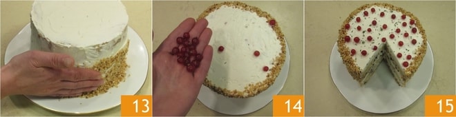 Dekorieren Sie die Seiten mit dem Haselnusskrokant bis zum oberen Rand 13. Schließlich garnieren Sie mit den Johannisbeeren 14 und ein paar Thymianblättern. Ihr Panettone gefüllt mit Sahne und Mascarpone ist bereit zum Servieren 15!