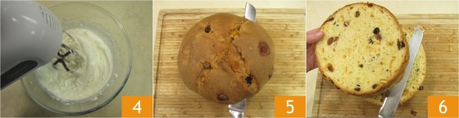 Sie sollten eine weiche und homogene Creme erhalten 4. Nehmen Sie den Panettone und entfernen Sie die obere Kappe 5, dann schneiden Sie ihn horizontal in 3 gleich dicke Scheiben 6.