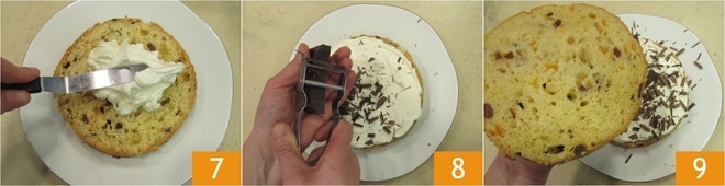 Legen Sie die erste Scheibe auf einen Servierteller und streichen Sie eine Schicht Creme mit einem Spatel darauf 7, dann fügen Sie mit einem Sparschäler feingehobelte Schokoladenstücke hinzu 8. Legen Sie die zweite Panettone-Scheibe darauf 9.