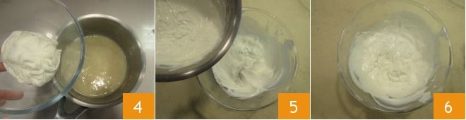 Dann den Herd ausschalten und 225 g griechischen Joghurt hinzufügen 4, gründlich umrühren und die erhaltene Mischung zur restlichen Menge Joghurt geben 5, umrühren, um die Creme gut zu vermischen 6, mit Frischhaltefolie abdecken und etwa 10-15 Minuten abkühlen und fest werden lassen.