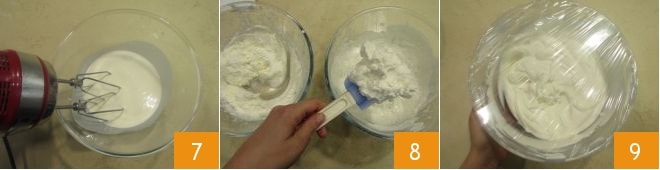 In der Zwischenzeit die restlichen 200 g gut gekühlte flüssige frische Sahne in eine Schüssel gießen und mit einem elektrischen Mixer aufschlagen 7, bis sie schaumig ist. Nun die frisch geschlagene Sahne zur inzwischen abgekühlten Creme hinzufügen 8. Vorsichtig mit einem Spatel umrühren, mit Frischhaltefolie abdecken 9 und für etwa 2 Stunden im Kühlschrank fest werden lassen.