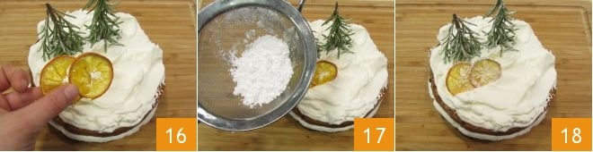 Fahren Sie nun mit der Dekoration fort: Pflanzen Sie seitlich zwei Rosmarinzweige ein, wobei die Spitzen der Nadeln nach unten zeigen, um kleine Tannen zu simulieren. Bringen Sie jetzt auch die beiden getrockneten Orangenscheiben an 16 und beenden Sie mit einer Prise Puderzucker 17. Ihr eindrucksvoller Panettone-Kuchen mit Nutella® ist bereit, auf den Tisch gebracht zu werden 18.