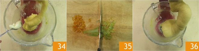 geben Sie die kandierten Früchte 37 und die Rosinen 38 in die Küchenmaschine. Starten Sie die Maschine erneut, immer auf niedriger Geschwindigkeit, um die kandierten Früchte und Rosinen unterzumischen 39.