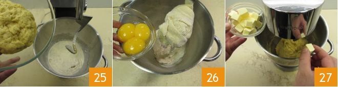 dann den aufgegangenen Teig 25 und den Roboter 2 Minuten bei mittlerer Geschwindigkeit starten. Mit dem weiterhin aktiven Haken die Eigelbe dazugeben und weiterarbeiten, bis sie vollständig eingearbeitet sind 26. Zum Schluss die Butter Stück für Stück hinzufügen 27 beide immer bei Raumtemperatur