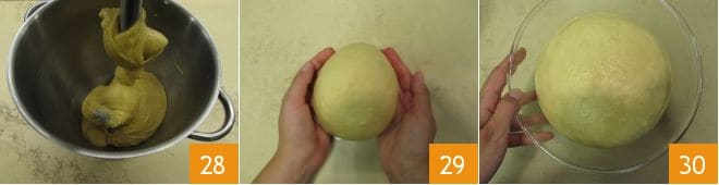 und etwa 5-6 Minuten arbeiten. Der Teig ist fertig, sobald er sich festheftet und glatt und elastisch ist 28. Den Teig erneut schleifen 29 und in eine Schüssel geben. Mit Frischhaltefolie abdecken und im ausgeschalteten Ofen mit einem Topf heißem Wasser für eine Stunde ruhen lassen 30.
