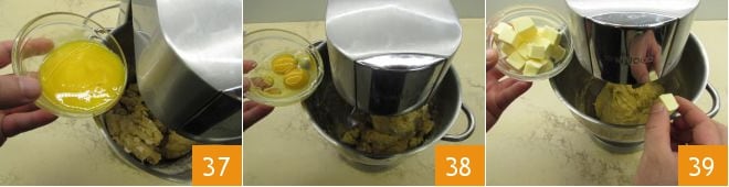 Den Roboter für 3-4 Minuten bei mittlerer Geschwindigkeit starten und anschließend die Eigelbe 37 und dann die Eier hinzufügen 38, weiter mischen, bis sie vollständig aufgenommen sind. Es wird einige Momente dauern, bis sie sich mit dem Rest des Teigs verbinden. Dann die in Stücke geschnittene, bei Raumtemperatur gelassene Butter einarbeiten 39,