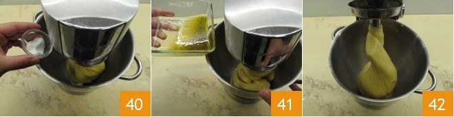 mit Salz abschmecken 40 und schließlich mit dem Panettone-Aroma, es wird einige Minuten dauern, bis es richtig eingearbeitet ist 41. Der Teig ist fertig, sobald er weich und glatt ist und sich an den Haken geheftet hat 42.