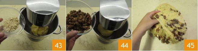 Sie können die zerkleinerten Mandeln 43 und die gut abgetropften Feigen hinzufügen 44. Die Maschine 3 Minuten arbeiten lassen, bevor Sie den Haken abnehmen und sich auf die Arbeitsfläche bewegen, um den Teig für wenige Augenblicke mit der Hand zu arbeiten: Es ist nicht nötig, die Fläche zu fetten, da der Teig viel Fett freisetzen wird 45.