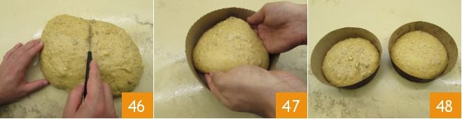 Teilen Sie den Teig in zwei Stücke von jeweils etwa 1150 g 46. Beide wie zuvor schleifen und dann in die niedrigen und breiten Kartonformen für 1 kg Panettone legen 47. Lassen Sie sie 3 Stunden im ausgeschalteten Ofen mit einem Topf mit heißem Wasser aufgehen 48.