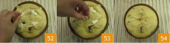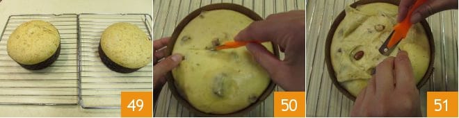 Nach der erforderlichen Zeit, damit die Panettoni aufgehen 49, nehmen Sie sie heraus und lassen Sie sie 10 Minuten an der Luft. Legen Sie sie auf das Gitter und ritzen Sie die Oberfläche mit einem Rasiermesser in Form eines Kreuzes ein 50. Die Seiten mit dem Schneider gut öffnen, während Sie die Kanten hochhalten 51.