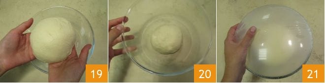 Den Teig mit den Händen schleifen, d. h. eine kugelförmige Form geben, indem die unteren Teile zur Mitte gezogen werden 19. Die Kugel in eine Schüssel legen 20 und mit Frischhaltefolie abdecken. Die Schüssel in den ausgeschalteten Ofen mit einem Topf mit heißem Wasser für etwa eine Stunde stellen 21.
