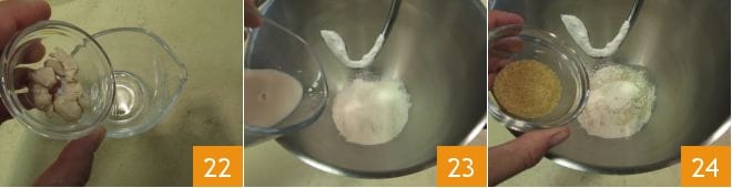 Sobald der Teig verdoppelt ist, können Sie mit dem zweiten Teig fortfahren. Die Hefe wieder in Wasser bei Raumtemperatur auflösen und in die Küchenmaschine geben, die noch mit Haken bestückt ist und in die Sie schon das Mehl gegeben haben 23. Den Zucker hinzufügen 24,