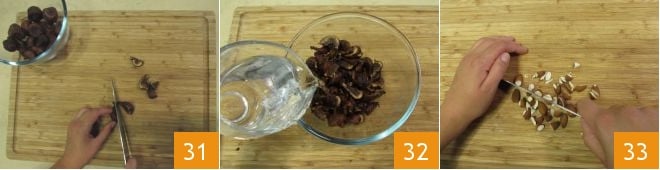 Es ist Zeit, sich um den dritten und letzten Teig zu kümmern. Die getrockneten Feigen zerkleinern 31 und in eine Schüssel geben, mit Wasser bei Raumtemperatur bedecken und so einweichen lassen 32, dann die Mandeln grob mit einem Messer zerkleinern 33.