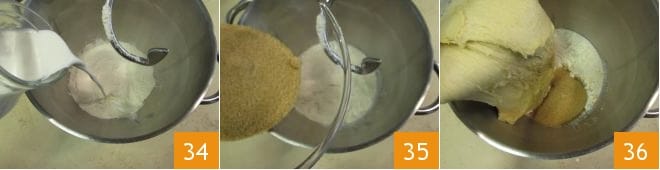 Jetzt, wo Sie alles haben, was Sie brauchen, geben Sie das Mehl und die Sahne bei Raumtemperatur in die Küchenmaschine mit Haken 34, den Zucker hinzufügen 35 und dann den aufgegangenen Teig 36.