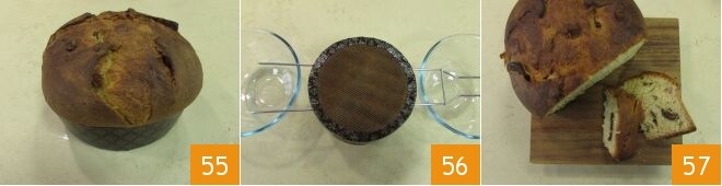 Ihre Panettoni sind bereit für das Backen: Lassen Sie sie in einem bereits auf 190 °C vorgeheizten Ofen im statischen Modus für etwa 75 Minuten backen. Um zu vermeiden, dass die Oberfläche des Gebäcks verbrennt, stellen Sie ein weiteres Backblech auf die oberste Schiene, so verhindern Sie, dass die Heizschlangen die Oberseite der Panettoni bräunen 55. Um sicherzustellen, dass die Panettoni durchgebacken sind, verwenden Sie ein Küchenthermometer und überprüfen Sie, dass im Kern 92 °C erreicht wurden. Sobald sie aus dem Ofen genommen wurden, stechen Sie sie mit Spießen 56 und lassen Sie sie die ganze Nacht über kopfüber 56. Hier sind Ihre Panettoni mit Trockenfrüchten bereit, alles was Sie tun müssen, ist, sie zu schneiden und zu genießen 57!