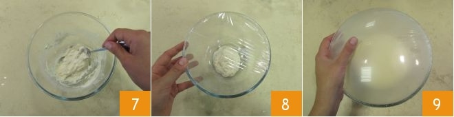Kurz mit einem Löffel kneten, bis eine Art weicher Teig entsteht 7, mit Frischhaltefolie abdecken und 1 Stunde bei Raumtemperatur gehen lassen 8. Nach der Zeit die Schüssel in den Kühlschrank stellen und 8-12 Stunden maximal reifen lassen 9.