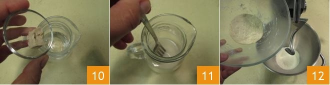 Am nächsten Tag die Hefe in einen Krug mit Wasser bei Raumtemperatur gießen 10, mit einer Gabel auflösen 11 und mit dem Teig beginnen. In einer Küchenmaschine mit Knethaken das Mehl, den Vorteig 12 hineingeben,