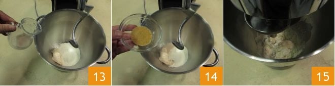 dann das Wasser mit der Hefe 13, den Zucker 14 und den Haken 1 Minute lang bei mittlerer Geschwindigkeit aktivieren 15.