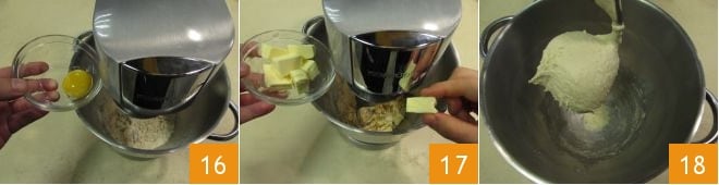 Mit dem weiterhin aktiven Haken das Eigelb dazugeben und noch 1 Minute kneten 16. Danach die Butter Stück für Stück einarbeiten und 5-8 Minuten kneten, bis der Teig glatt und kompakt ist 17. Zudem muss er sich an den Haken heften, d. h. sich wörtlich daran festklammern 18.