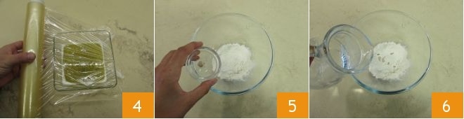 Mit Frischhaltefolie abdecken und bei Raumtemperatur stehen lassen 4. In der Zwischenzeit das Mehl in eine Schüssel geben, die Hefe darüberbröckeln 5 und das Wasser bei Raumtemperatur einfüllen 6.