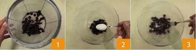 Die Sauerkirschen abtropfen lassen 1, es werden 150 g benötigt. Mit 15 g Mehl bestäuben 2 und umrühren 3. Die Zartbitterschokolade grob hacken und beiseite stellen.
