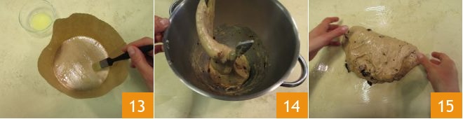 In der Zwischenzeit eine hohe Panettone-Form mit einer Kapazität von 750 g einfetten. Nach den 10 Minuten die Maschine wieder einschalten und den Teig weitere 10 Minuten kneten, bis er glatt und am Haken befestigt ist 14. Den Teig auf eine gefettete Fläche geben und schnell mit den Händen bearbeiten 15.